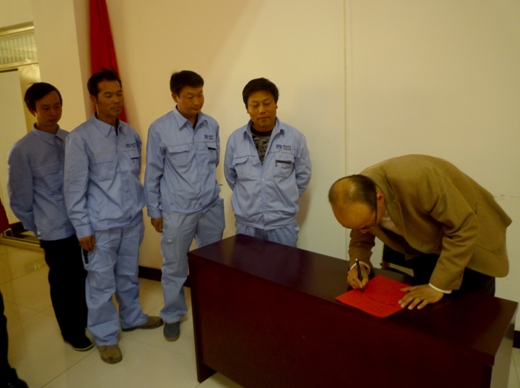 動員大會上各級領(lǐng)導、各車間管理干部、車間班組長上臺進行“百日安全大練兵”活動簽字儀式。